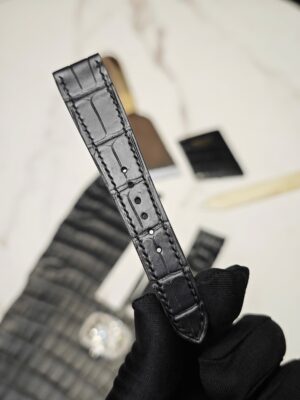 Dây đồng hồ Franck Muller da cá sấu Pháp màu đen là lựa chọn mang tính nền tảng cho những chiếc đồng hồ có thiết kế cầu kỳ và giàu bản sắc như Franck Muller. Với mặt số đặc trưng mang dáng tonneau, nhiều lớp chi tiết và tỷ lệ khác biệt, Franck Muller đòi hỏi dây đeo không chỉ đẹp, mà còn phải được chế tác chuẩn xác để đạt sự cân bằng về thẩm mỹ và cảm giác đeo.