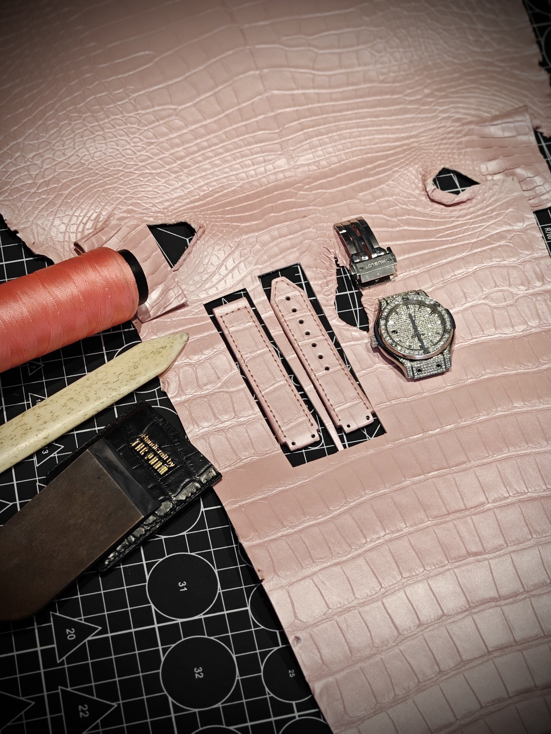 Dây đồng hồ Hublot Classic Fusion da cá sấu Pháp màu hồng không chỉ là một phụ kiện, mà là kết quả của quá trình làm nghề nghiêm túc – nơi từng mũi kim, đường chỉ đều mang mục đích rõ ràng và được hoàn thiện bằng kinh nghiệm tích lũy theo thời gian.