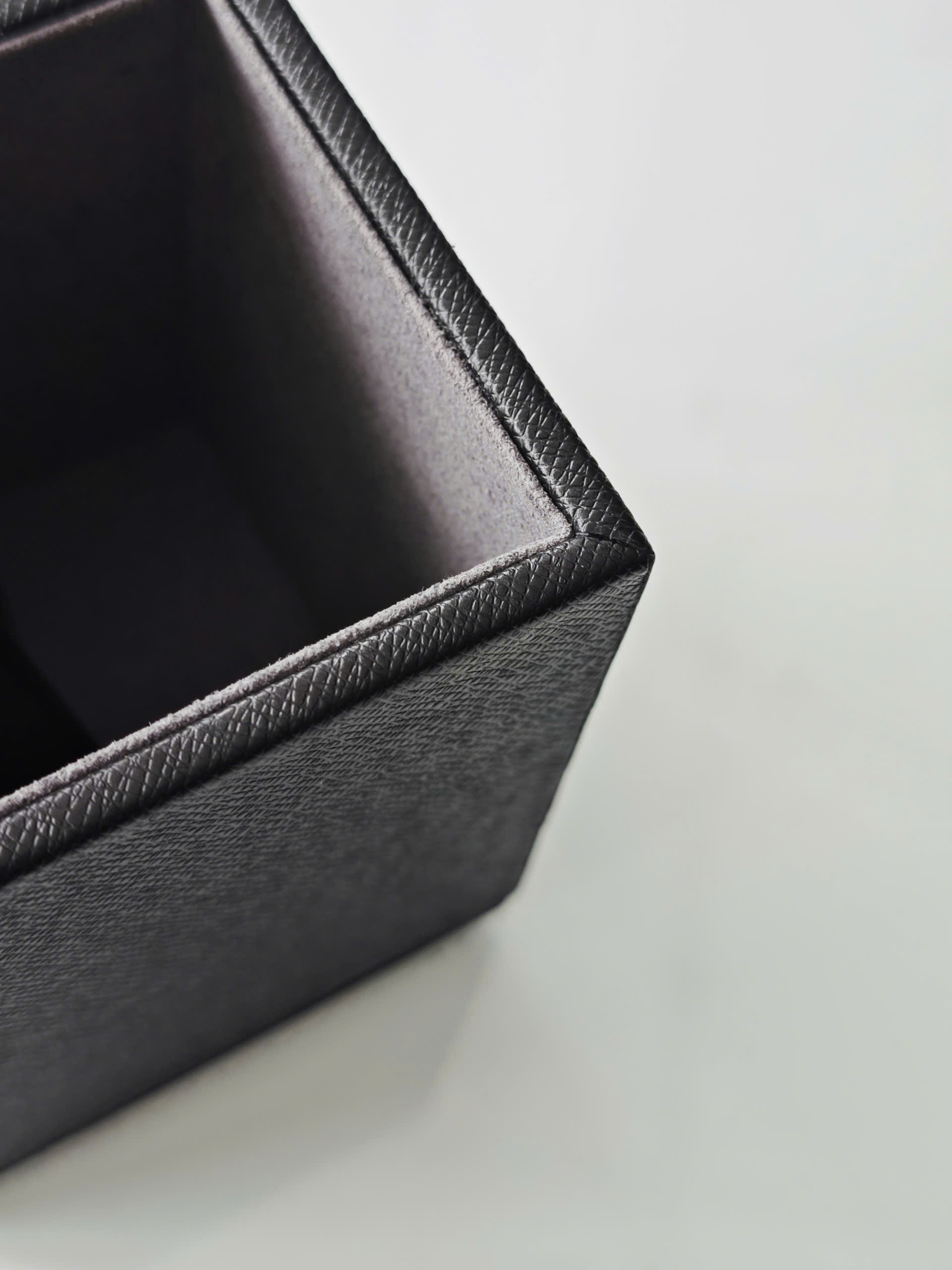 Điểm nhấn đặc biệt của TP Pen Box Signature chính là chất liệu da Taiga Thule Ý (tham khảo thêm về da Ý cao cấp tại Conceria Thule). Đây là dòng da nổi tiếng với vân dập đặc trưng, độ bền vượt trội và khả năng chống trầy xước.