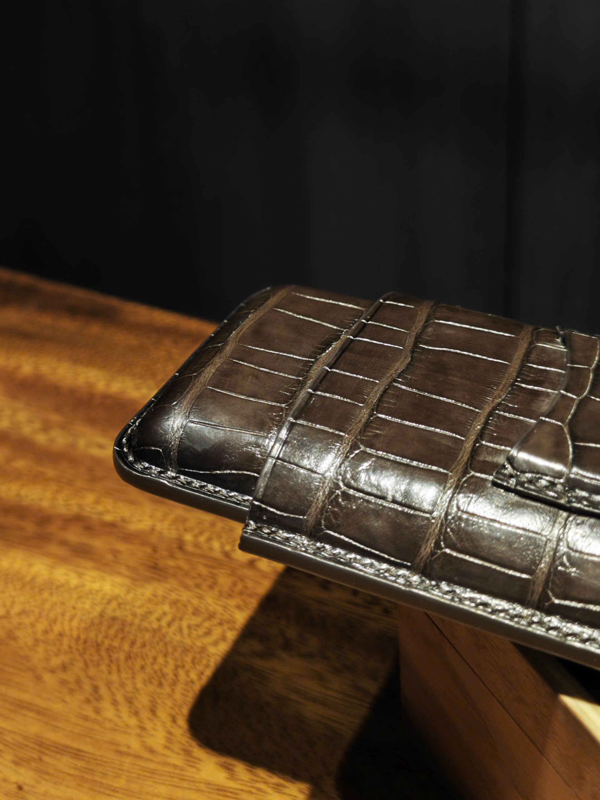 Phiên bản vân đuôi đòi hỏi kỹ thuật chế tác cao hơn do bề mặt da có độ gồ tự nhiên. Để giữ được form chuẩn cho bao da xì gà 3 điếu, từng mũi khâu phải chính xác và cân đối, không làm lệch nhịp vảy.