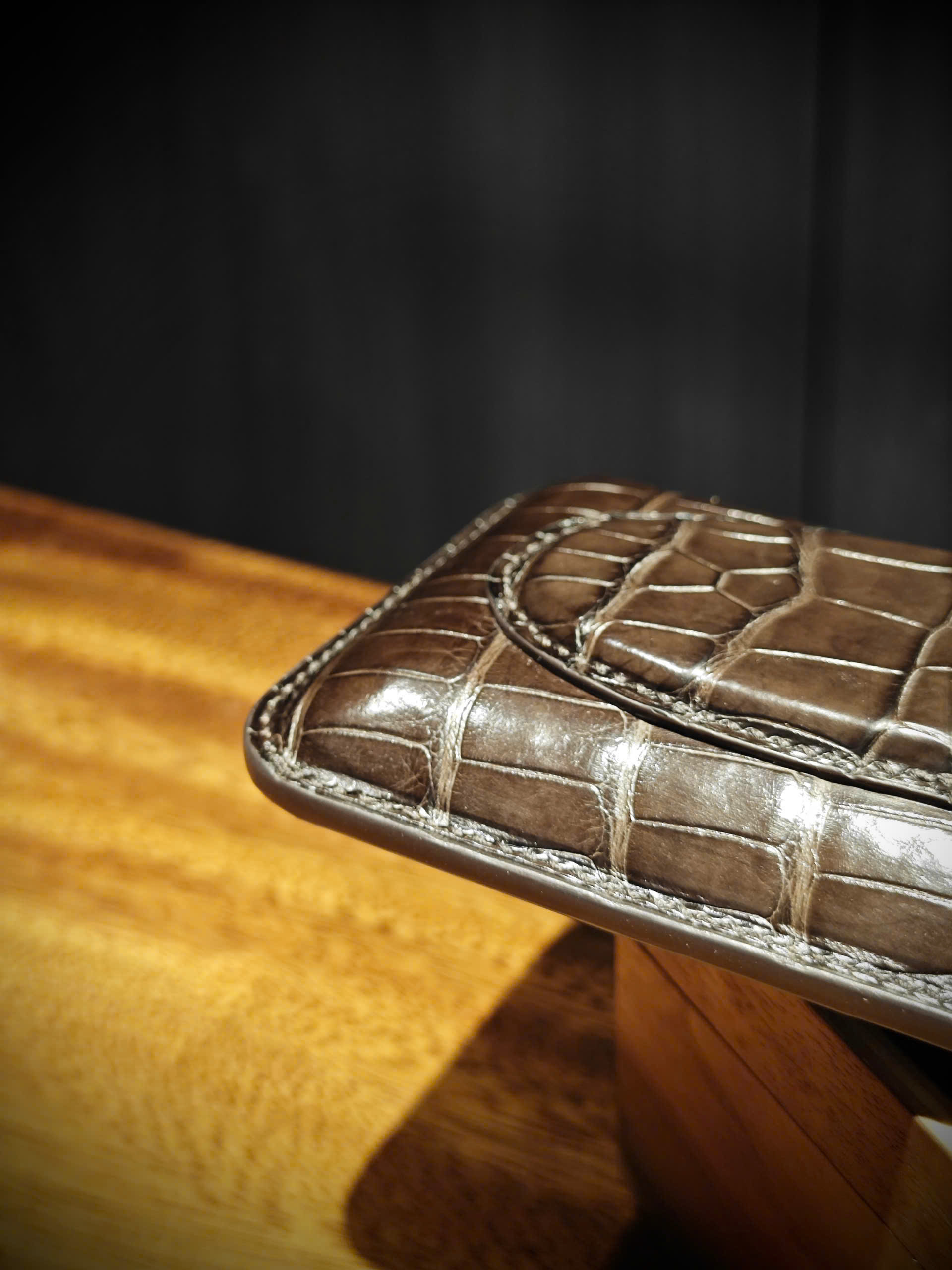 Phiên bản vân đuôi đòi hỏi kỹ thuật chế tác cao hơn do bề mặt da có độ gồ tự nhiên. Để giữ được form chuẩn cho bao da xì gà 3 điếu, từng mũi khâu phải chính xác và cân đối, không làm lệch nhịp vảy.